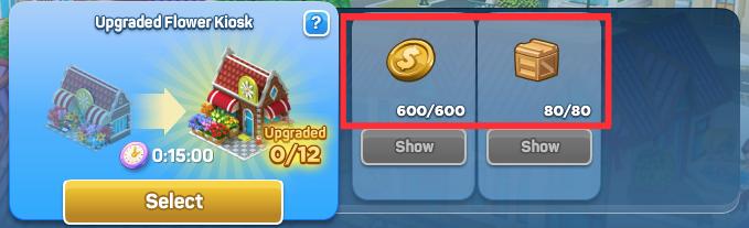 For example, you can upgrade 10 Bakeries and 12 Flower Kiosks: