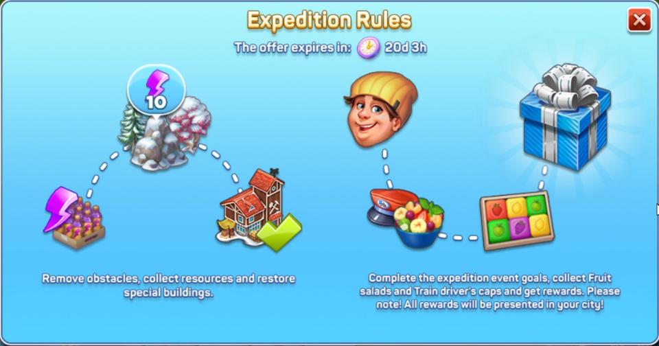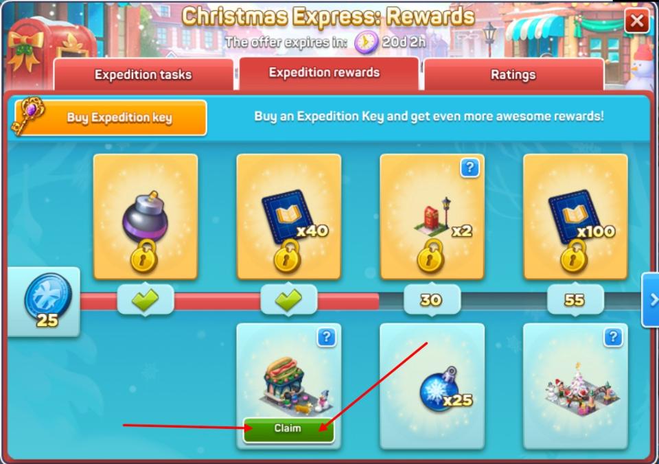 On the first tab, you see the expedition tasks you need to complete to get points and obtain the Christmas Railway Station.