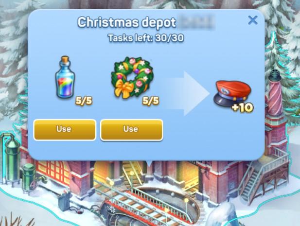 6. Collect 300 Train driver’s caps to get the final reward – the Christmas Depot: 6000 coins, 3-6 baubles, 1 useful item, and 2-5 energy every 24 hours.