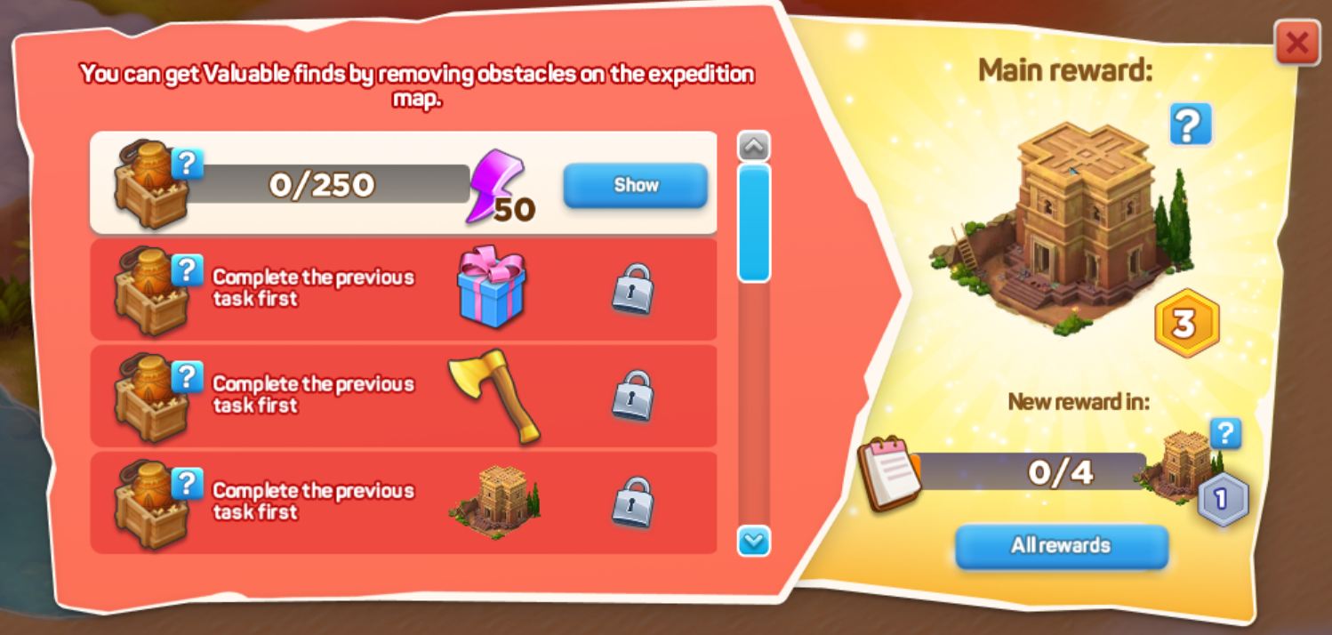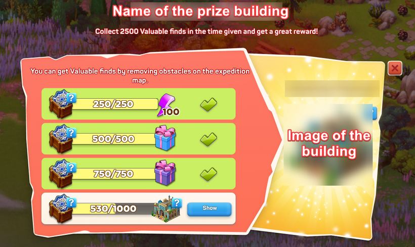 Before: You play the expedition, collect valuable finds, and receive milestone rewards plus the main reward—a unique building.