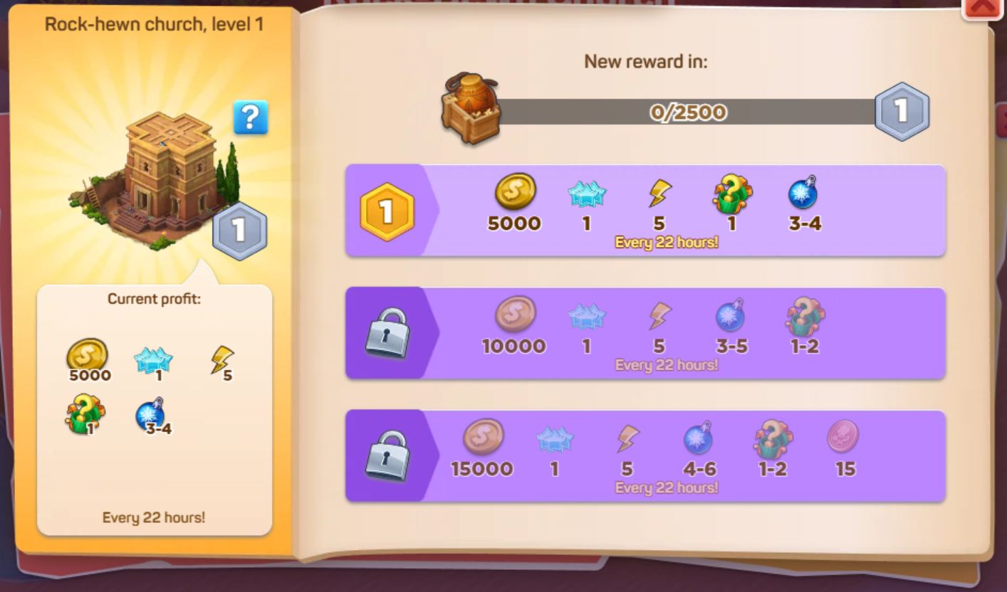 Level 2: 10 000 coins, 1-2 useful items, 3-5 glass baubles/daffodils every 22 hours